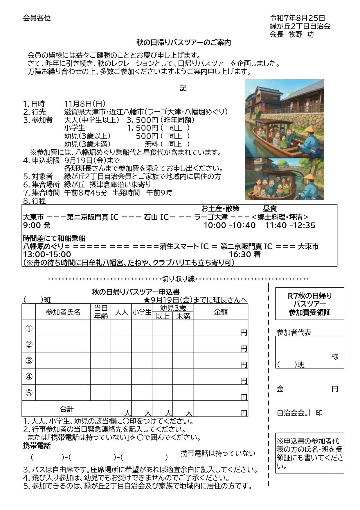 会員宅に各戸配布した下記の申込書と参加費を添えて、9月19日(金)までに各班長さんまでお申し込みください。